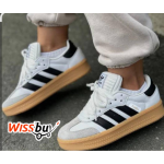 - Couleur : Base blanche avec les trois bandes emblématiques d’Adidas en cuir noir contrastant.