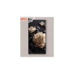 Il s’agit d’une œuvre d’art murale ou d’une toile représentant des fleurs en relief, probablement des pivoines ou des roses, avec des pétales dorés et des feuilles sombres.L’œuvre présente un style moderne et abstrait, avec un contraste marqué entre les éléments dorés et le fond noir. L’effet de relief ajoute une dimension sculpturale. La palette de couleurs est dominée par le noir pour le fond et les feuilles, et des nuances de doré et de crème pour les fleurs, créant une esthétique luxueuse. Les fleurs sont disposées verticalement, avec une grande fleur centrale et des fleurs plus petites au-dessus et en dessous, créant un équilibre visuel.
