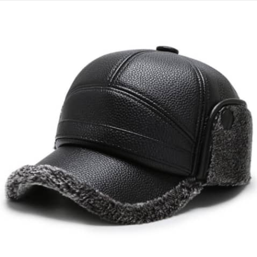 Ce bonnet d’aviateur noir est conçu pour l’hiver et présente un extérieur en similicuir lisse, avec une visière incurvée. Les cache-oreilles et le revers sont doublés d’une matière douce et duveteuse de couleur marron clair, offrant une chaleur supplémentaire. Il y a un petit bouton noir sur le côté de chaque cache-oreille, suggérant qu’ils peuvent être attachés ou ajustés. La casquette a un style classique qui allie fonctionnalité et mode.