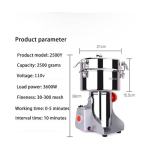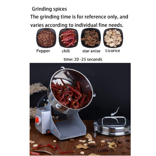 • Capacité : 2500 grammes, tension : 110 V, puissance de charge : 3600 W, finesse : 30-300 mesh. Interrupteur d’alimentation de synchronisation : fermez le couvercle et allumez l’alimentation, réglez l’heure et éteignez l’alimentation une fois l’écrasement terminé. Contrôlez l’épaisseur comme vous le souhaitez.