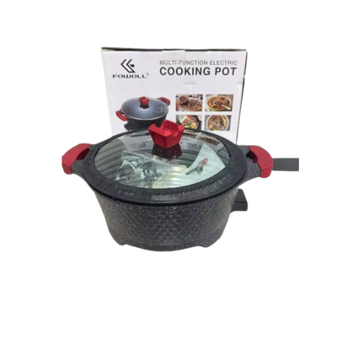 Il s’agit d’un appareil de cuisson polyvalent conçu pour une variété de tâches culinaires. D’après l’image, il semble s’agir d’une cocotte électrique de style marmite avec un revêtement antiadhésif et une finition texturée (peut-être de type granit ou pierre). Les poignées rouges et le bouton du couvercle ajoutent une touche de couleur. Le couvercle en verre transparent permet de surveiller facilement les aliments pendant la cuisson sans avoir à le soulever.