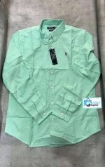 Cet article est une chemise boutonnée à manches longues pour homme, présentée dans une nuance de vert clair éclatante, souvent appelée vert menthe ou vert écume de mer. La chemise est dotée d’un col classique avec des boutons, indiquant qu’il s’agit d’un style de col boutonné (« button-down »). Le tissu semble être un mélange léger de coton ou de lin, lui conférant un aspect légèrement texturé et respirant, adapté à une tenue décontractée ou chic-décontractée.