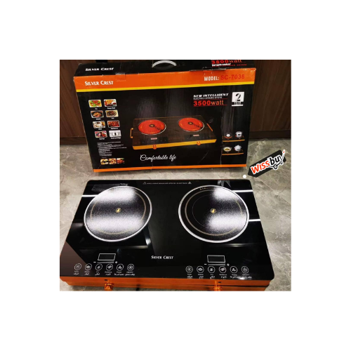 L’image présente une cuisinière électrique en céramique double brûleur de la marque Silver Crest, modèle SC-7038, La puissance nominale est de 3500 watts, avec des variations de 2000 à 2200 watts selon les sources, Utilise la technologie infrarouge pour un chauffage rapide et une cuisson économe en énergie.  Convient à tous les types d’ustensiles de cuisson, contrairement aux plaques à induction qui nécessitent des ustensiles spécifiques.