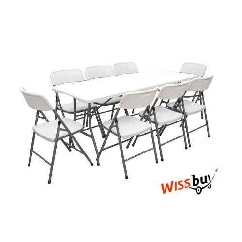 Voici le Salon proprement dit ! Tout en métal blanc, il se compose d’une table rectangulaire demontable et de 8 chaises pliables, pratique pour son rangement !
