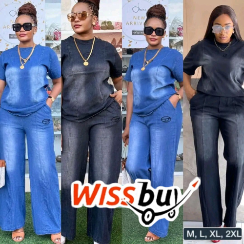 Cet ensemble décontracté de Wissbuy se compose d’un haut à manches courtes et d’un pantalon taille haute à coupe large, offrant confort et style. Fabriqué dans un tissu d’aspect denim, il est disponible en deux coloris classiques : un bleu jean clair et un noir délavé. Le haut présente un col rond simple et une coupe ample, tandis que le pantalon assure une liberté de mouvement optimale. Idéal pour un look quotidien et polyvalent, cet ensemble est proposé dans une gamme de tailles allant du M au 2XL.