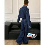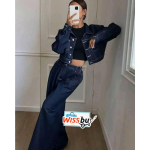 Cet ensemble en denim se compose d’une veste courte de style blouson et d’un pantalon large à taille haute. La veste est dotée de boutons sur le devant, de poches plaquées au niveau de la poitrine et de coutures apparentes qui accentuent le style décontracté du denim. Le pantalon, de coupe palazzo ou flare, présente une silhouette ample des hanches jusqu’aux chevilles, offrant confort et fluidité. Les deux pièces sont confectionnées dans un denim de couleur bleu foncé, créant une tenue coordonnée et tendance.