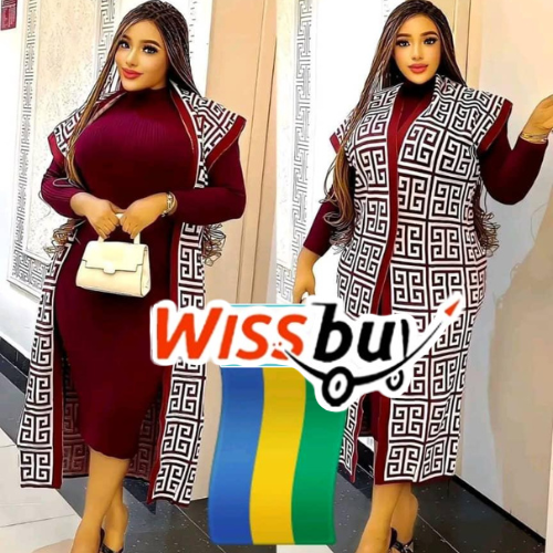 Cet ensemble sophistiqué comprend une robe midi moulante de couleur bordeaux unie, à col montant et à manches longues, offrant une silhouette élégante et ajustée. Il est accompagné d’un long gilet ouvert et fluide, sans manches, présentant un motif géométrique distinctif en noir et blanc, qui ajoute une touche de contraste et de modernité à la tenue. Le gilet est conçu pour être porté par-dessus la robe, créant une superposition chic et structurée.