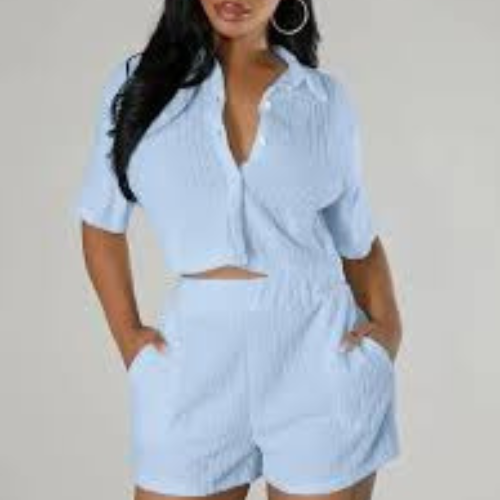 Ensemble deux‑pièces femme bleu ciel composé d’une chemise courte boutonnée et d’un short taille haute. La chemise, à manches courtes et coupe légèrement oversize, présente un col classique et une longueur raccourcie qui découvre délicatement la taille. Le short, fluide et confortable, marque la taille pour une silhouette structurée tout en offrant une aisance de mouvement grâce à sa coupe légèrement ample. Confectionné dans un tissu léger au tombé souple, cet ensemble est parfait pour les journées chaudes et les sorties décontractées — facile à porter de jour comme en soirée en variant les accessoires (sandales pour un look casual, talons pour une tenue plus sophistiquée). Entretien simple : lavage à froid ou cycle délicat, séchage à l’air.