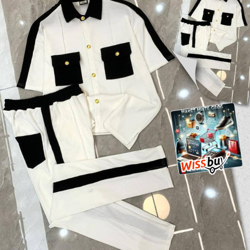 L’image présente un ensemble de vêtements masculin, composé d’une chemise à manches courtes et d’un pantalon assorti, principalement de couleur blanche avec des détails noirs. La chemise est dotée de deux poches plaquées noires sur la poitrine avec des boutons dorés, et le pantalon présente des bandes noires latérales et une poche arrière noire. Une version plus petite de cet ensemble est également visible en haut à droite. En bas à droite, une image promotionnelle avec le logo « Wissbuy » montre divers articles comme des chaussures, un ordinateur portable et d’autres accessoires.
