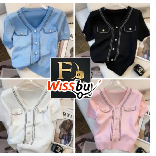 - Design : Col en V, manches courtes, coupe courte (crop top), fermeture boutonnée sur le devant.
