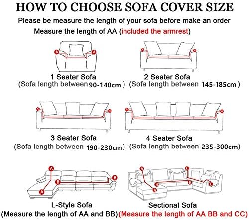 - Taille: 1 siège: 90cm-140cm; 2 sièges: 145cm-185cm; 3 sièges: 195cm-230cm; 4 sièges: 235cm-300cm. Il n’y a qu’une seule housse de canapé dans l’emballage. Si vous souhaitez acheter une housse de canapé en forme de L (canapé d’angle), veuillez en choisir deux!