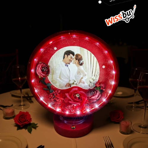 • Objet central lumineux : Un cadre photo rond ou sphérique, illuminé par des LED rouges, contenant une photo de couple.