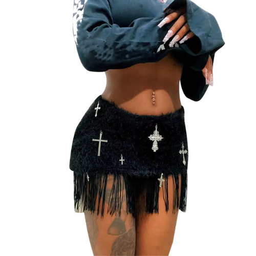Plongez dans l’esthétique audacieuse avec cette mini-jupe noire en fausse fourrure, conçue pour celles qui osent affirmer leur style. Inspirée des tendances Y2K et gothiques, cette jupe présente une texture douce et luxueuse grâce à sa fausse fourrure, agrémentée de pampilles délicates qui ajoutent du mouvement et du dynamisme à chaque pas. Les croix métalliques, dispersées stratégiquement sur la jupe, apportent une dimension punk et mystérieuse. Sa taille haute et sa coupe moulante épousent les formes, créant une silhouette flatteuse et moderne. Fabriquée à partir d’un mélange de polyester et de spandex, elle assure confort et élasticité, la rendant parfaite pour les événements où le style et la liberté de mouvement sont essentiels. Que ce soit pour une soirée à thème, un concert ou simplement pour exprimer votre individualité au quotidien, cette jupe est une pièce maîtresse qui ne manquera pas de faire tourner les têtes.