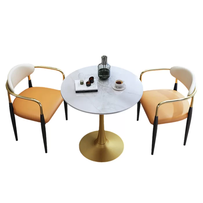 • Table : La table à manger  est de forme ronde avec un plateau blanc (similaire au verre marbré blanc mentionné dans les résultats de recherche) et un pied central de couleur or, offrant un style contemporain et élégant.