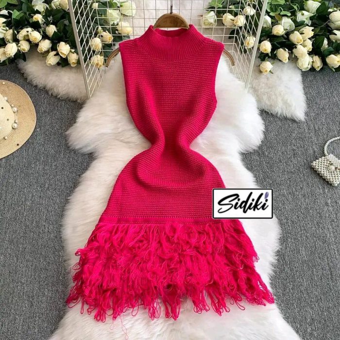 La caractéristique la plus marquante de cette robe réside dans son ourlet : une abondante bordure de franges texturées et volumineuses. Ces franges apportent non seulement du mouvement et de la fluidité à la robe, mais aussi une touche de style bohème chic ou de modernité audacieuse.