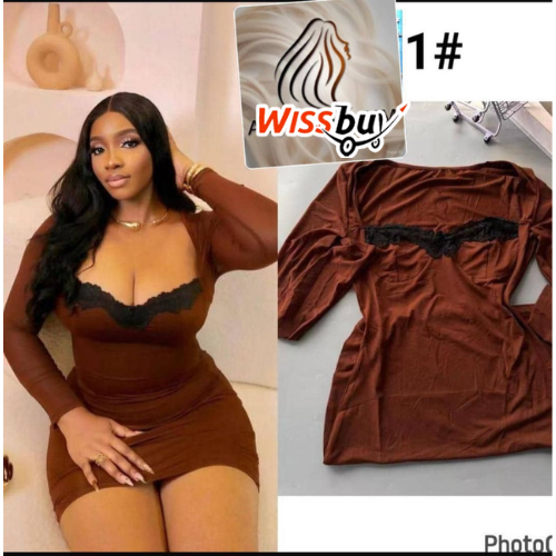 ette robe est une robe moulante à manches longues, de couleur marron ou rouille. Elle présente un décolleté plongeant orné d’un empiècement en dentelle noire, ajoutant une touche de sophistication et de sensualité. La coupe ajustée met en valeur la silhouette, tandis que les manches longues offrent une certaine couverture. Le tissu semble être extensible et confortable, épousant les formes du corps. Elle est adaptée pour des occasions décontractées chic ou des sorties.