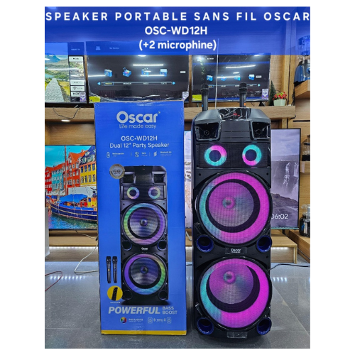 Ceci est un Haut-parleur de Fête (Party Speaker) portable sans fil de grande taille de marque Oscar, modèle OSC-WD12H (Dual 12″ Party Speaker). Il est conçu pour les événements, offrant une ambiance festive avec un son très puissant et des effets lumineux dynamiques.