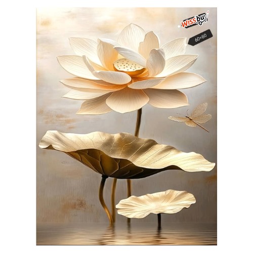 Ce magnifique tableau intitulé « Éveil Doré » met en scène une fleur de lotus majestueuse s’élevant au-dessus de l’eau, ses pétales ivoire aux reflets dorés s’ouvrant avec grâce. Deux grandes feuilles dorées, flottant délicatement à la surface, apportent équilibre et harmonie à la composition. Une libellule transparente vole tout près, ajoutant une touche de légèreté à l’ensemble. Le fond dans des nuances douces de beige et de brun crée une atmosphère sereine, idéale pour une décoration zen, moderne ou nature. Cette œuvre évoque la paix intérieure, la pureté et la beauté intemporelle de la nature.