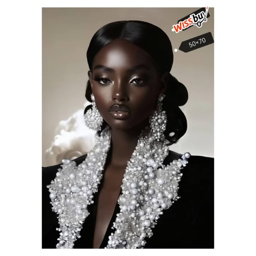Perles de Grâce est un tableau artistique saisissant, représentant une femme noire au port majestueux, parée d’une imposante parure de perles blanches. Son regard profond et assuré évoque à la fois force, élégance et sérénité. La texture des perles, travaillée avec un réalisme bluffant, contraste magnifiquement avec son teint ébène et sa tenue noire. Ce portrait, à la croisée de la haute couture et de l’art contemporain, capte l’essence du luxe et de la beauté féminine dans toute sa puissance. L’arrière-plan sobre et doux permet à la figure centrale d’occuper toute l’attention. Cette œuvre iconique est idéale pour une décoration sophistiquée, que ce soit dans un salon moderne, une galerie d’art ou un espace de travail élégant.