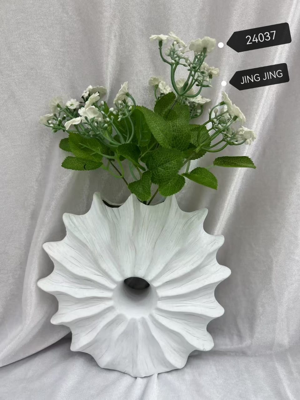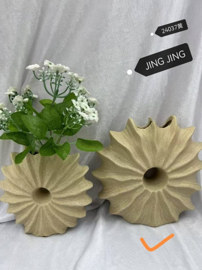 : Il s’agit probablement d’un vase en céramique ou en matériau similaire, présentant une texture plissée ou en forme d’éventail, évoquant un motif de soleil ou de fleur stylisée. Certains vases de ce type peuvent être fabriqués à partir de matériaux recyclés comme la pâte de papier mâché.